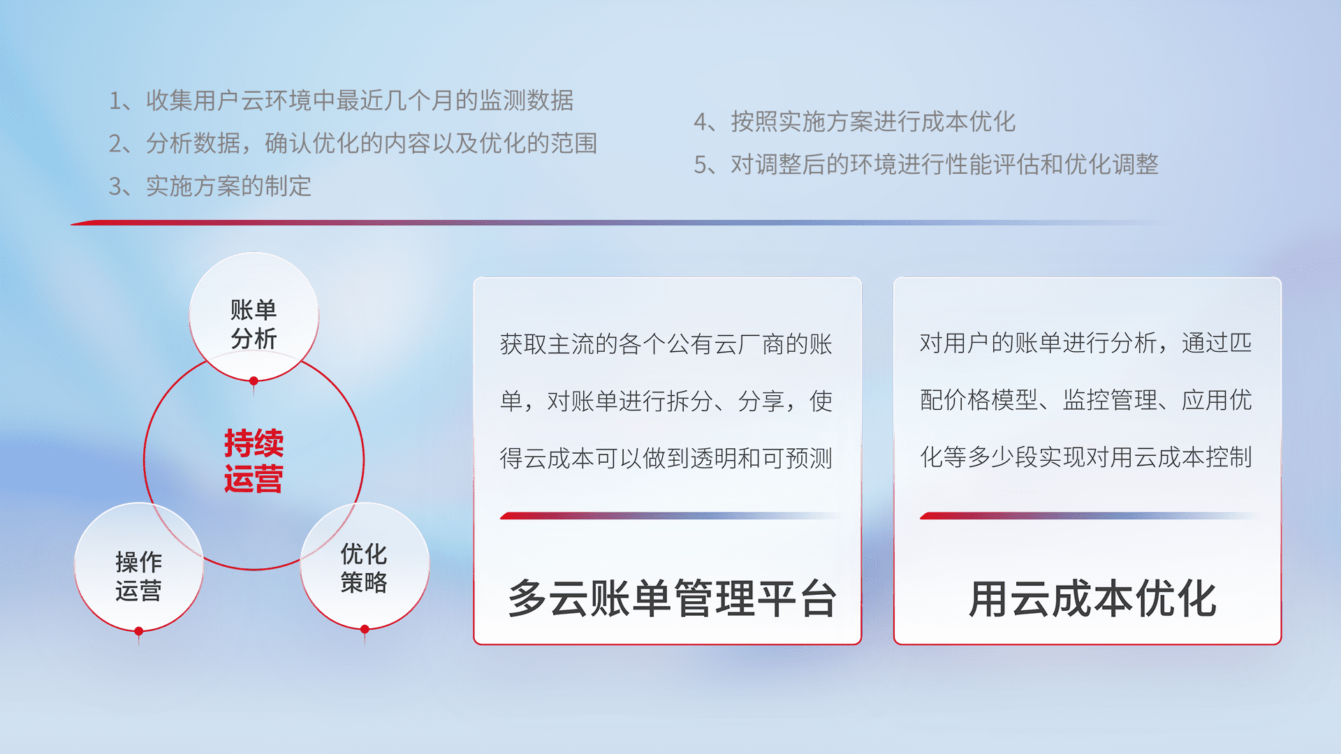 通过多云纳管,,,以统一的资源数据模型把客户的云资源进行抽象和封装,,,,进而实现对多云资源的统一操作,,,保障云资源管理的可靠性、、、稳定性与可用性。。量身定制化运维内容,,配置、、、开发运维、、、补丁管理、、、备份、、监控、、、认证和访问管理、、审计和日常巡检等,,保障在用云过程中的可靠度,,,,稳定度以及高可用率。。。。