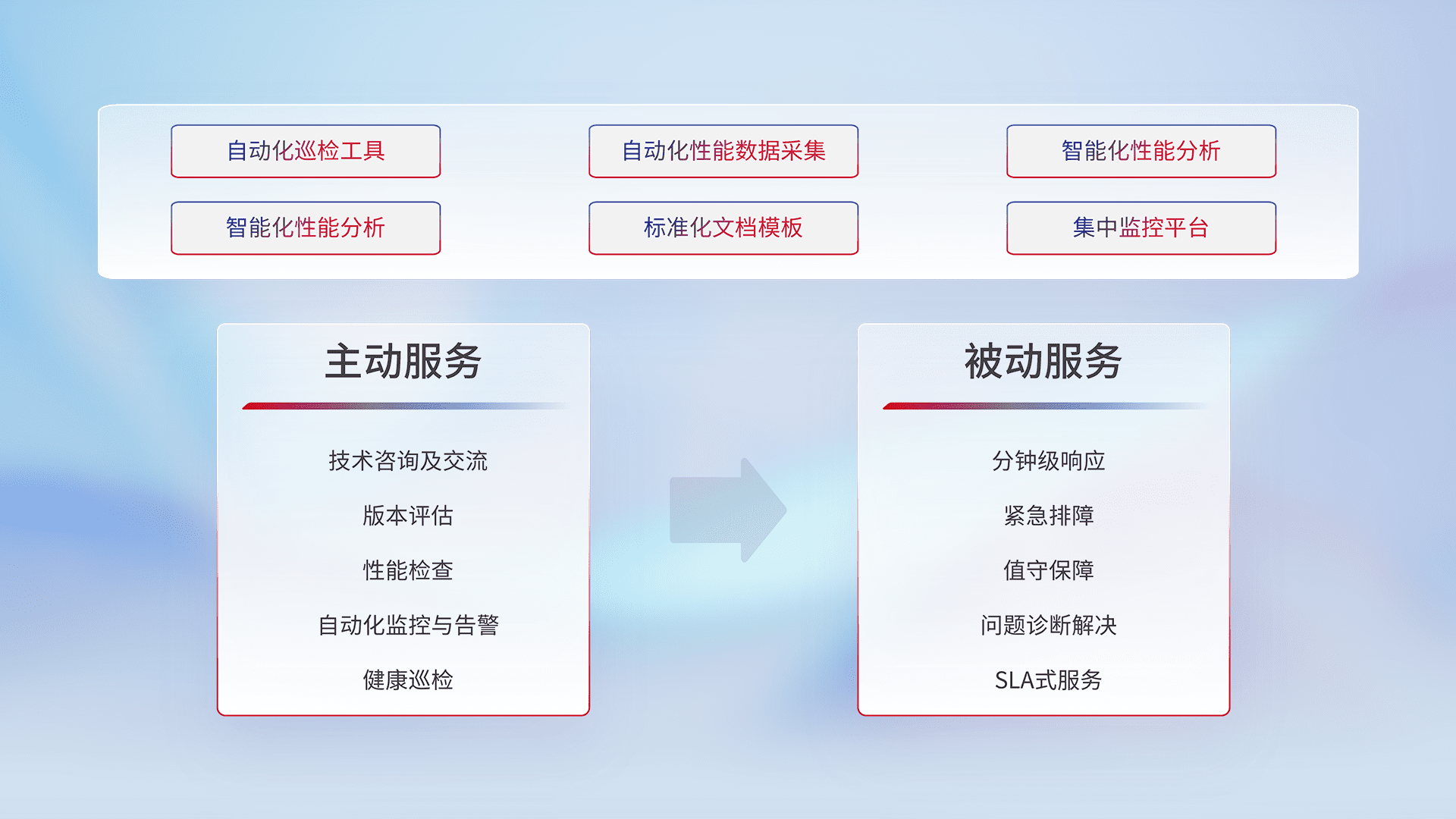 智能化工具和标准化文档,,,保障服务质量,,提供主动服务(包含技术咨询、、、版本评估、、性能检查、、、、自动化监控与告警、、、、健康巡检)和被动服务包含(分钟级响应、、、紧急排障、、、、值守保障、、、、问题诊断解决、、SLA服务)。。。